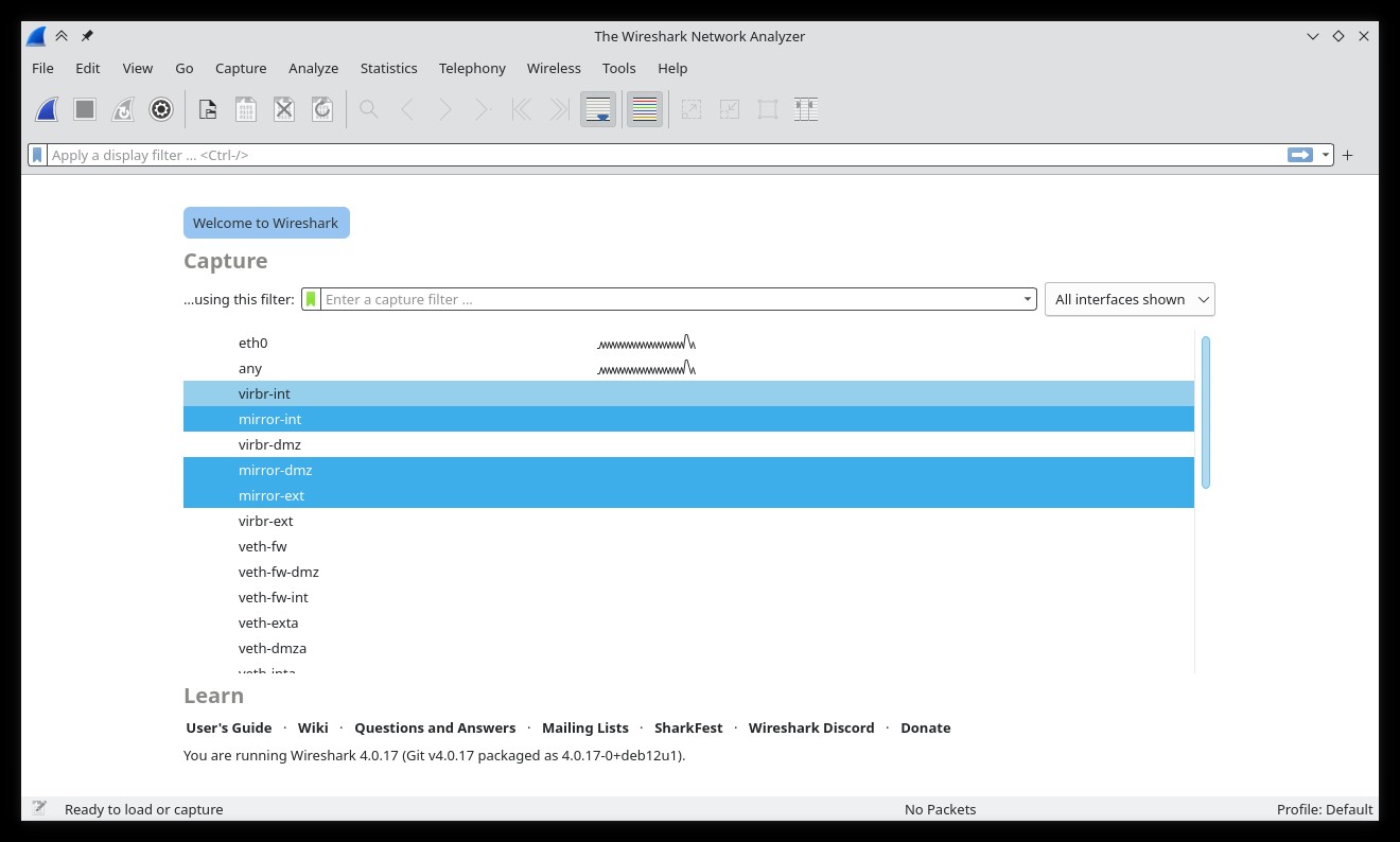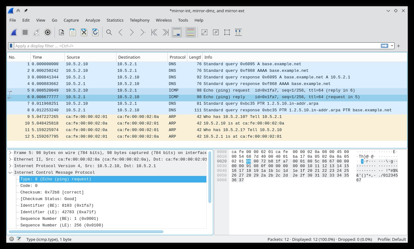 Note that 'base' has access both to the external network ('ext') and the screened subnet ('dmz') through its 'virbr-ext' and 'virbr-dmz' network interfaces, respectively. However, in order to be able to capture all the network traffic, each switch has a mirror port, named after its network ('mirror-ext' and 'mirror-dmz'). Thus, we will be able to capture the traffic on either network (or on both at the same time) since packets will travel from 'exta' to 'fw' through the external network and then from 'fw' to 'www.example.net' ('dmza') through the 'dmz' network, and back. For this exercise, we will assume that we are interested only in the traffic in the 'dmz' network, so mirror port 'mirror-dmz' will be used.