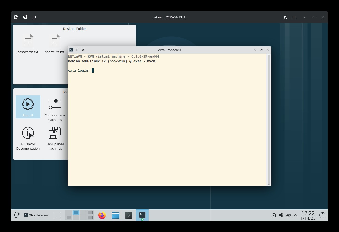 NETinVM is a virtual machine image that provides the user with a complete computer network. For this reason, NETinVM can be used for learning about operating systems, computer networks and system and network security.